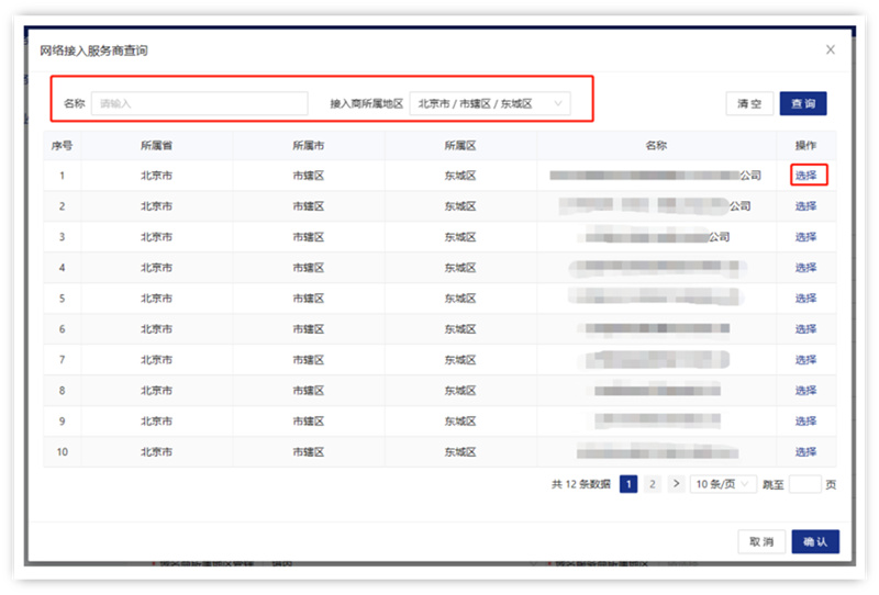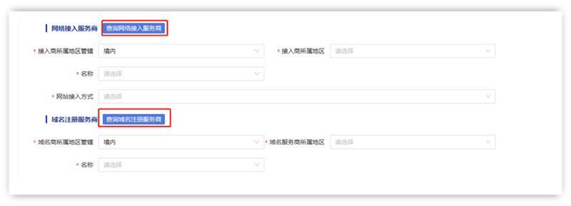 其中,网络接入服务商和域名注册服务商可通过“查询网络接入服务商”按钮和“查询域名注册服务商”按钮进行查找。网络接入服务商查找应先填写“名称”和“接入商所属地区”作为查询条件,其中“接入商所属地区”为必填项。查询到信息后,点击“选择”即可回填信息。若查询不到相关信息,则可手动填写服务商信息。服域名注册服务商同理。