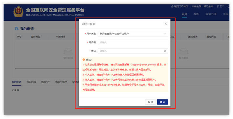 平台只会迁移旧系统中的有效信息,如旧账号下无有效主体、网站、安全评估,将无法迁移